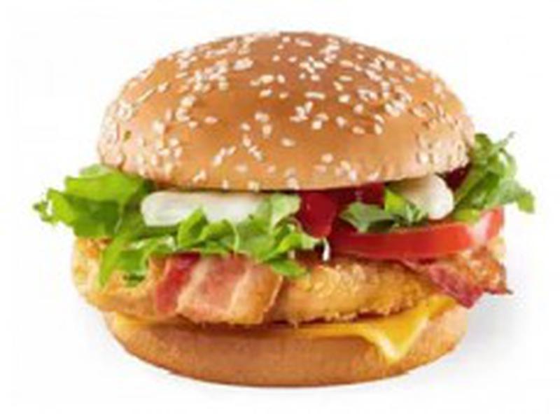 Состав: Сочная куриная котлета в хрустящей панировке, сыр Чеддер, ароматный бекон, ломтик помидора, свежий салат, специальный соус и булочка с кунжутом