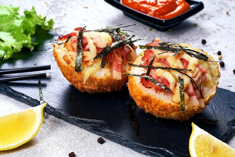 Состав: Бекон, яйцо, сыр, рис. Подается со сливочным соусом.