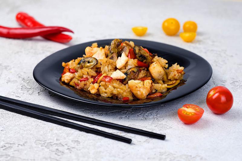 Состав: Рис, креветка, лосось, кабачок, перец болгарский, шампиньоны, кунжут. Соус на выбор: сладкий чили, соево-кунжутный, том ям.