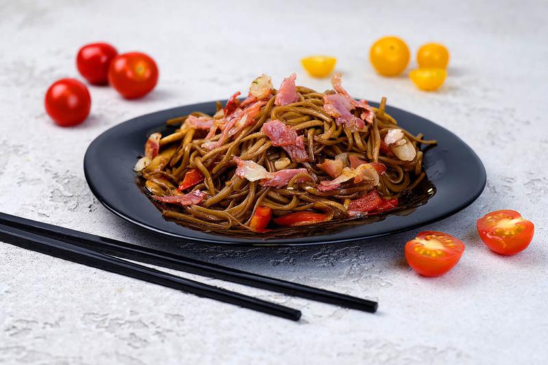 Состав: Лапша соба, бекон, кабачок, перец болгарский, шампиньоны, кунжут. Соус на выбор: сладкий чили, соево-кунжутный.