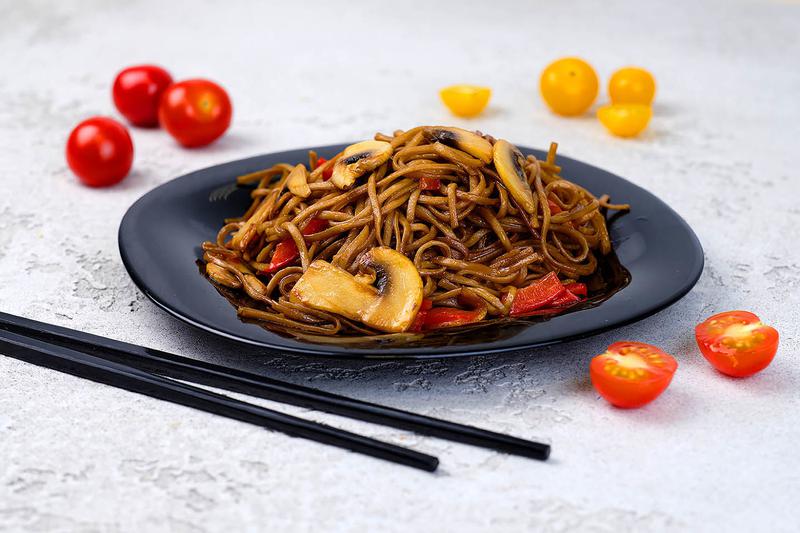 Состав: Лапша соба, кабачок, перец болгарский, шампиньоны, кунжут. Соус на выбор: сладкий чили, соево-кунжутный, том ям.