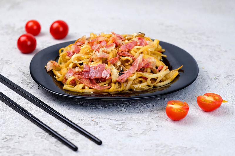 Состав: Лапша удон, бекон, кабачок, перец болгарский, шампиньоны, кунжут. Соус на выбор: сладкий чили, соево-кунжутный.