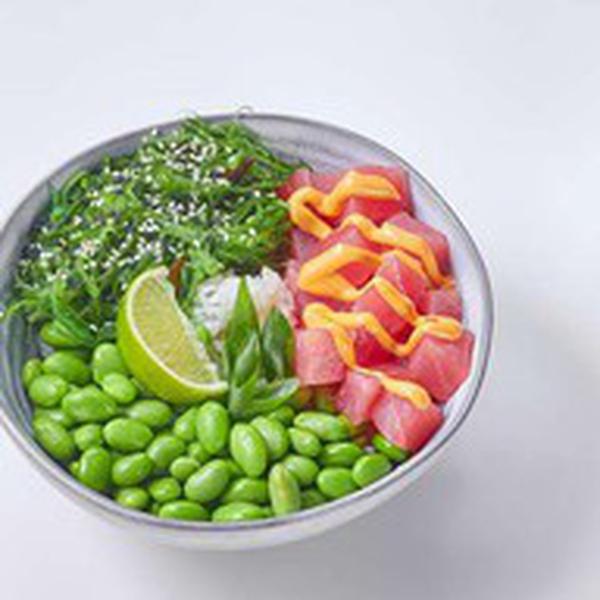 Состав: Тунец, бобы эдамаме, водоросли чука, зеленый лук, кунжут, ореховый соус, спайси соус, поке соус, лайм, рис