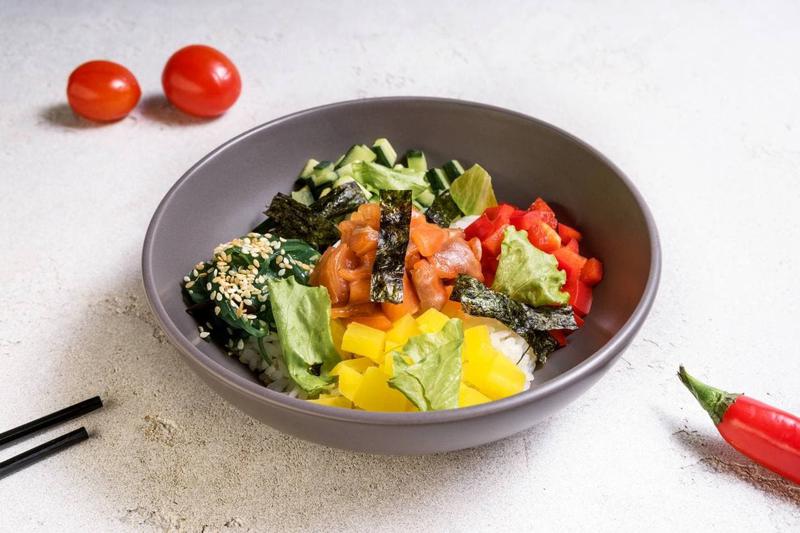 Состав: Рис, лосось, огурец, перец болгарский, лист салат, такуан, чука, нори, кунжут