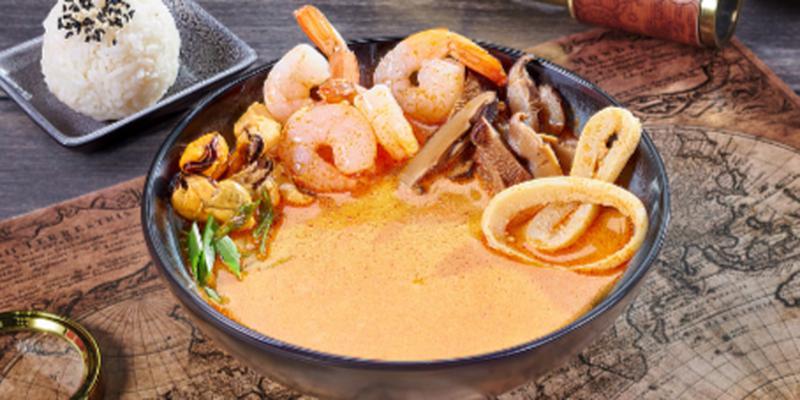 Состав: Бульон том ям, мидии, кальмар, креветки, грибы шиитаке, зеленый лук