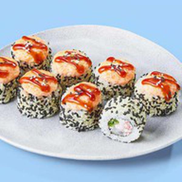 Состав: Крабовые палочки, креветка, фирменный сырный соус (майонез, сыр пармезан, оранжевая икра масаго), унаги соус, огурец, кунжут, рис (рис, вода, заправка для риса), нори *Не забудьте заказать имбирь, васаби и соевый соус. Они не входят в стоимость заказа.