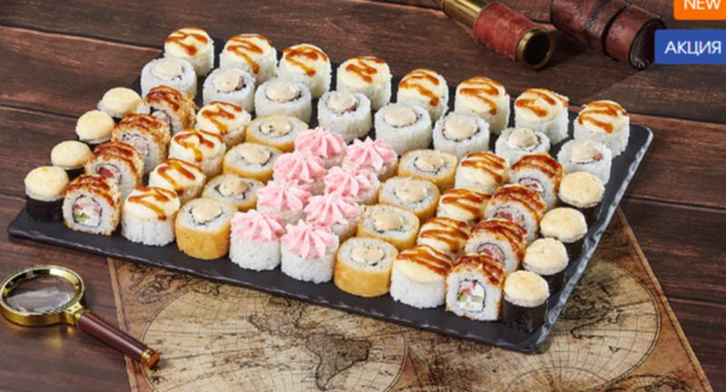 Состав: Ролл Кентукки (8 шт), ролл Кракатау с крабом (8 шт), ролл Кентукки хот (8 шт), ролл Охотский краб (8 шт), ролл Египетская курица (8 шт), ролл Мальта с сыром (8 шт), ролл Монтана (8 шт). *Не забудьте заказать имбирь, васаби и соевый соус. Они не входят в стоимость заказа.