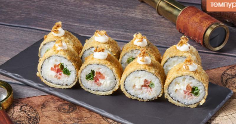 Состав: Бекон, сливочный сыр, зеленый лук, помидор, темпурный кляр, панировочные сухари, цезарь соус, лук фри, рис, нори. *Не забудьте заказать имбирь, васаби и соевый соус. Они не входят в стоимость заказа.