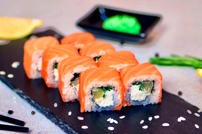 Состав: Лосось, лимон, лук зеленый, сыр творожный, рис, нори.