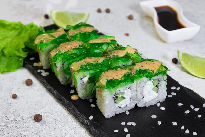 Состав: Творожный сыр, огурец, ореховый соус, водоросли чука, рис, нори