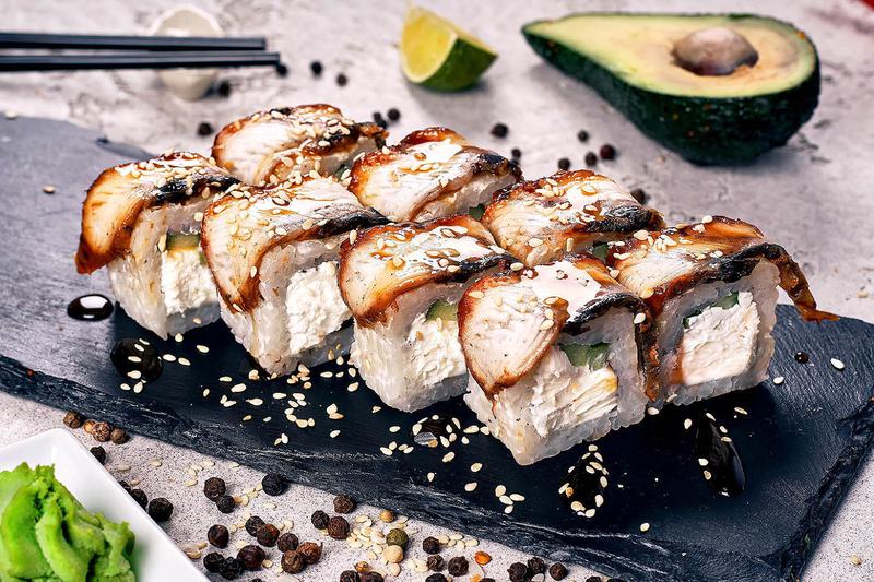 Состав: Угорь копченый, огурец, сыр творожный, кунжут, рис, нори.