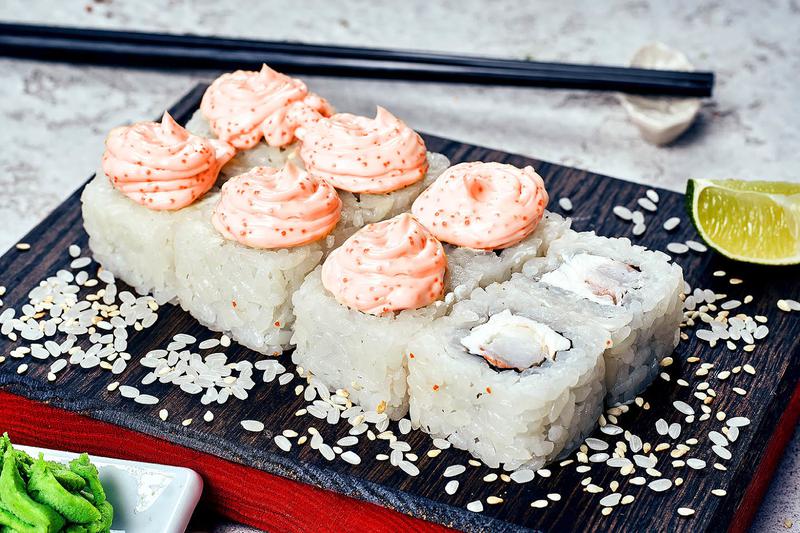 Состав: Креветка, сыр творожный, соус лава, рис, нори.
