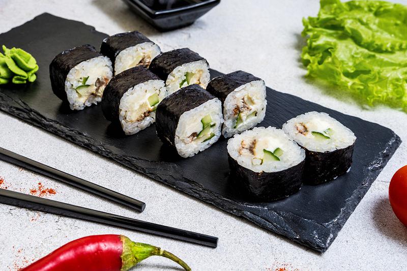 Состав: Копченый угорь, огурец, омлет, творожный сыр, рис, нори.