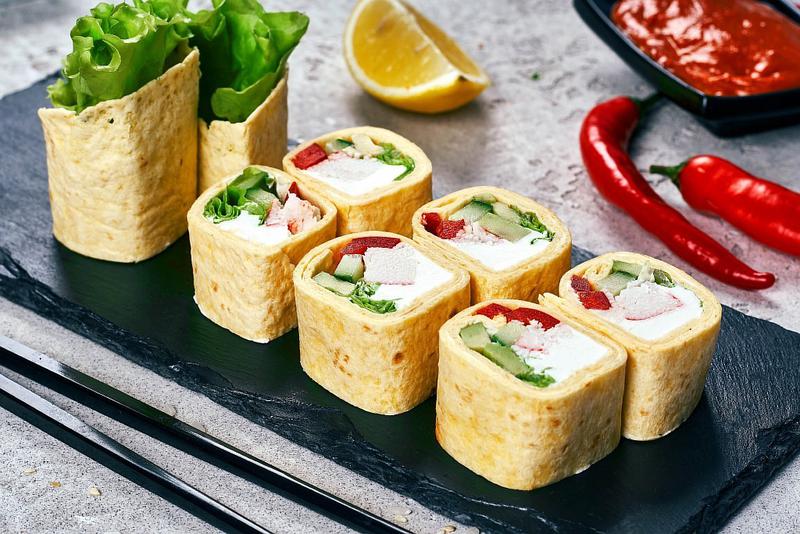 Состав: Крабовые палочки, огурец, перец болгарский, лист салата, сыр творожный, мексиканская лепешка