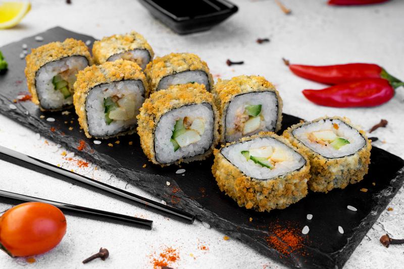 Состав: Угорь копченый, омлет, огурец, сыр творожный, рис, нори, соус кабаяки