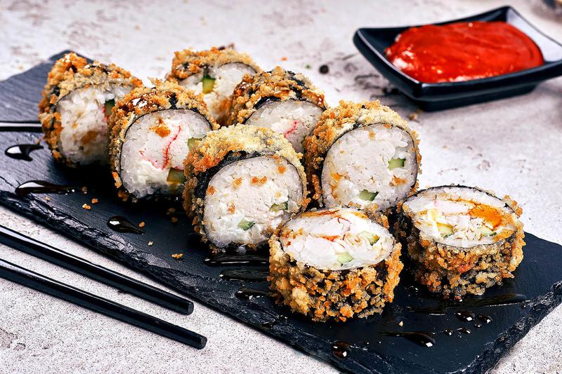 Состав: Крабовые палочки, сыр творожный, огурец, рис, нори, соус кабаяки