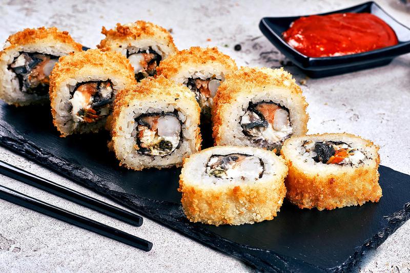 Состав: Креветка, лосось, сыр творожный, рис, нори. Подается со сливочным соусом.