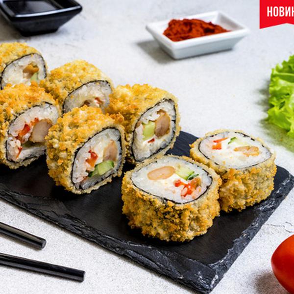 Состав: курица в терияки, перец болгаский, огурец, лист салат, сыр творожный, рис, нори, соус кабаяки