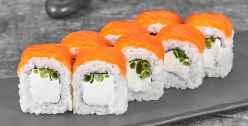 Состав: Сливочный сыр, лосось, зеленый лук, рис, нори