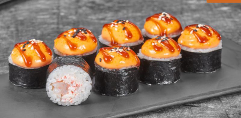 Состав: Креветка, краб-микс соус, унаги соус, яки соус, кунжут, рис, нори